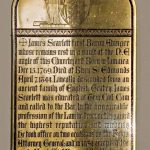 James Scarlett, Burial Register C432. The glass of the east window of the chancel erected 1856-57, partly shattered by an explosion on the common May 1942, completely destroyed 3 Aug 1944. James died 1844, his eldest son died in 1861