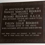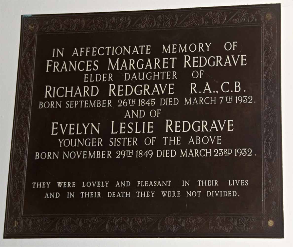In Affectionate Memory of Frances Margaret Redgrave. Elder daughter of Richard Redgrave RA CB Born September 26th 1945 died March 7th 1932. And of Evelyn Leslie Redgrave younger sister of the above. Born November 29th 1849 died March 23rd 1932. "They were lovely and pleasant in their lives and in their death they were not divided"
