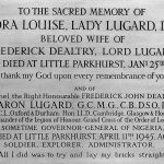 To the sacred memory of Flora Louise Lady Lugard DBE beloved wife of Frederick Dealtry Lord Lugard who died at Little Parkhurst January 25th 1929. "I thank my God upon every remembrance of you". And of Colonel the Right Honourable Frederick John Dealtry Baron Lugard GCMG CB DSO PC Hon DCL Oxford & Durham; Hon LLD Cambridge, Glasgow & Hong Kong; a Commander of the Legion of Honour; Grand Cross of the Order of Leopold II; Sometime Governor-General of Nigeria, who died at Little Parkhurst April 11th 1945 aged 87. Soldier, explorer, administrator. "All I did was to try and lay my bricks straight"