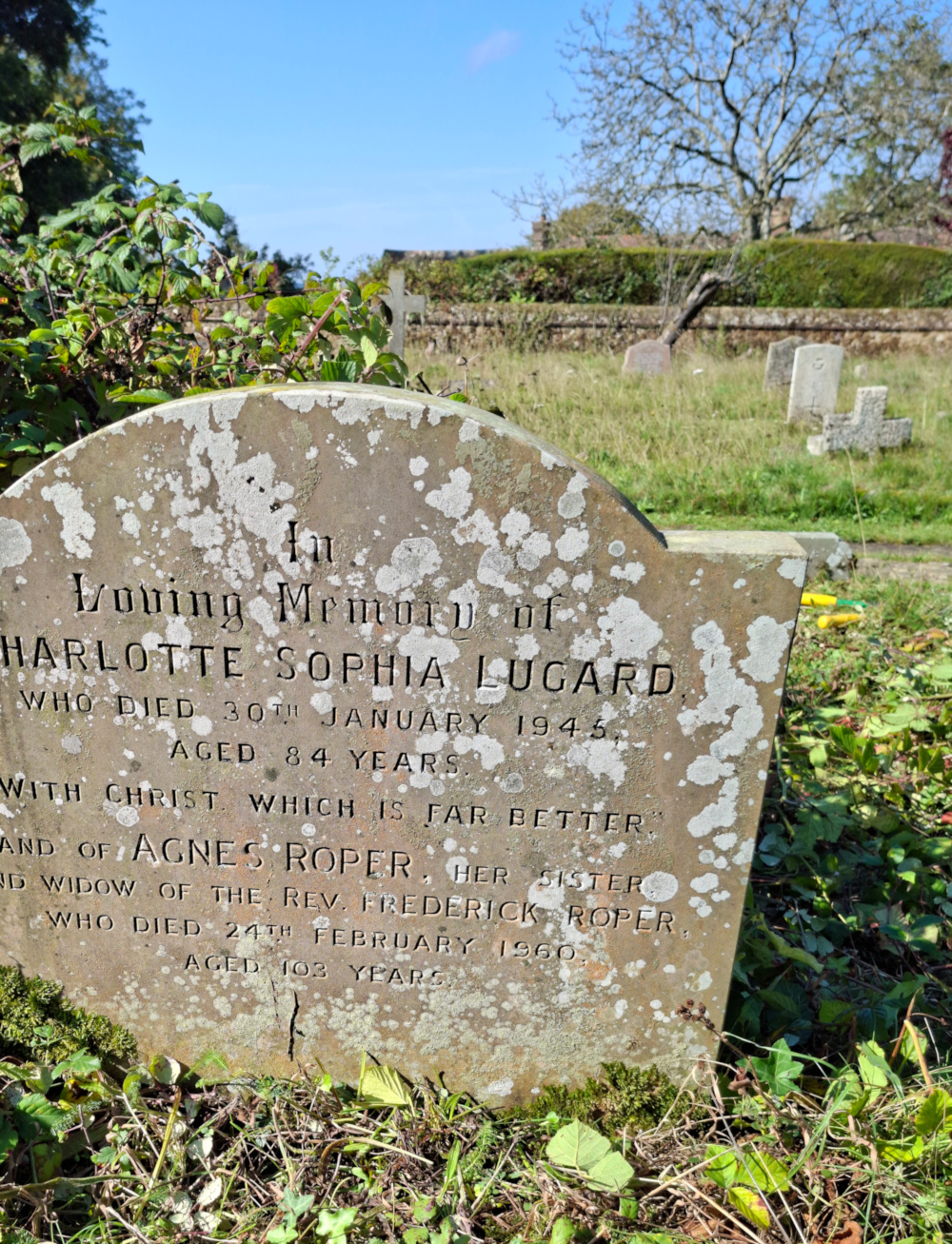 In loving memory of Charlotte Sophia Lugard who died 30th January 1945 aged 84 years. "With Christ which is far better". And of Agnes Roper her sister and widow of the Rev. Frederick Roper, who died 24th February 1960 aged 103 years.